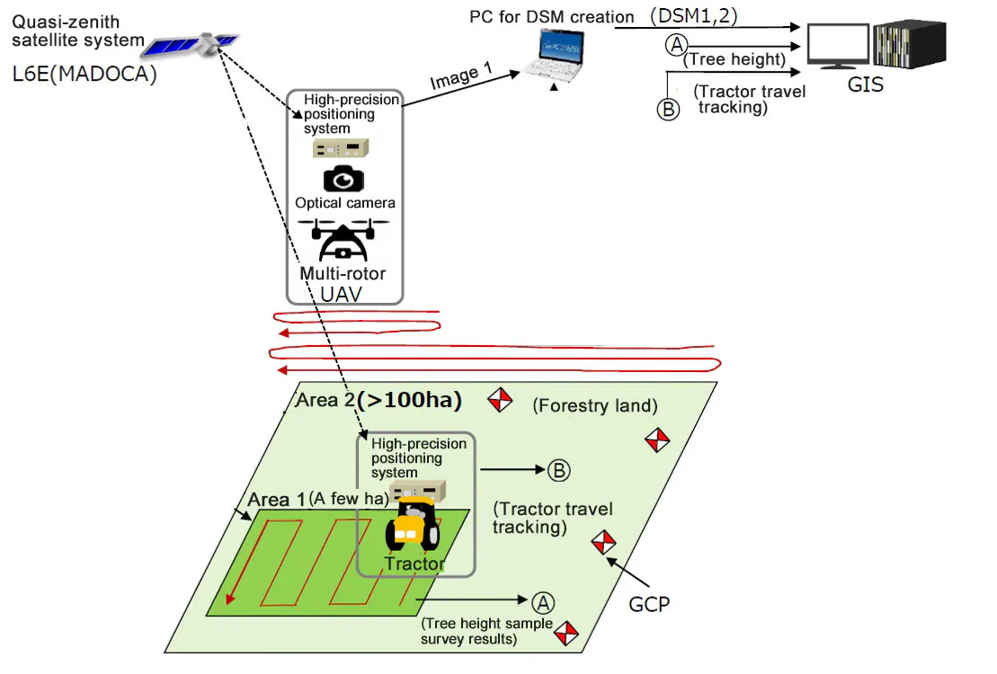 Especificamente, isso significava um sistema que utiliza drones e tratores equipados para obter informações posicionais de alta precisão do Michibiki para medição de altura de árvores. Drones voando sobre terras de reflorestamento são usados para capturar imagens das áreas a serem medidas. As posições das copas das árvores são, então, inicialmente calculadas a partir desses dados de imagem e dados de informações de posição do drone.