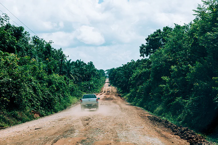 Caminhonete dirigindo por uma estrada de terra através de um vasto terreno de reflorestamento