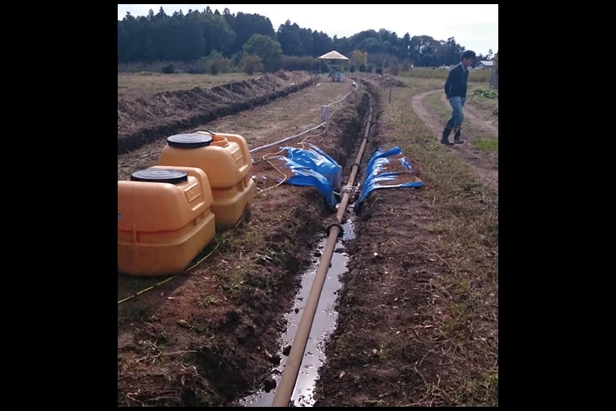 Local de teste em terras agrícolas na província de Ibaraki, com canos de água criados pela equipe do projeto